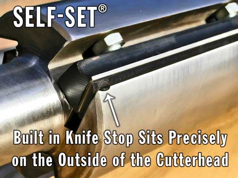 3. Slide the assembled SELF-SET® holder and knife in your cutter head knife pocket until the stops contact the top of cutter head on the back side of the knife pocket. Tighten the gib bolts.